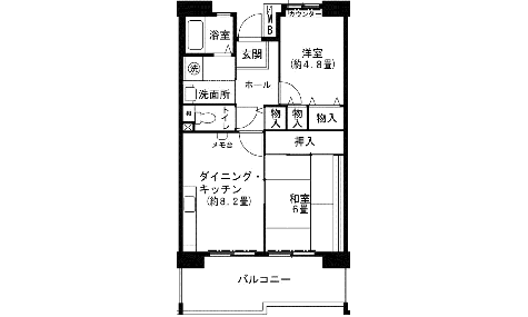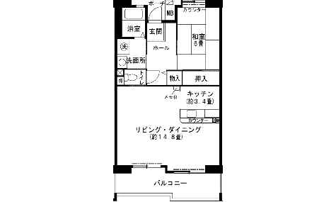 次の画像は、ルゼフィール名谷東団地の1LDKの間取りの一例です。広めのリビング・ダイニングが特徴です。和室を洋室化したタイプの間取りも、一部にはございます。